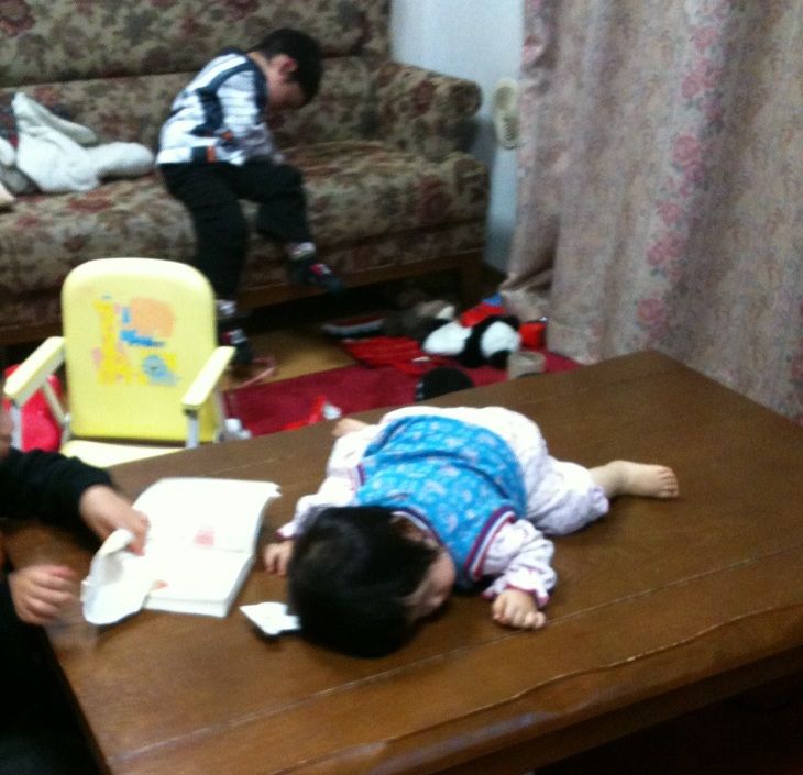 頼みました。ももはテーブルの上でいないいないばあを