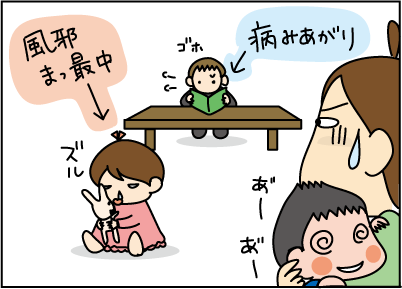 歩けないりくに、ハイハイのももは風邪ひいてるし