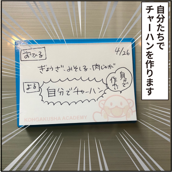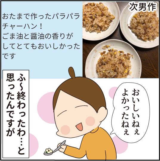 我が家もこの休み中長男がチャーハンを何回か作ってくれました。自信ついて昨日は親子丼に挑戦!ハードルが高かったらしく、台所も本人も大変な事に…