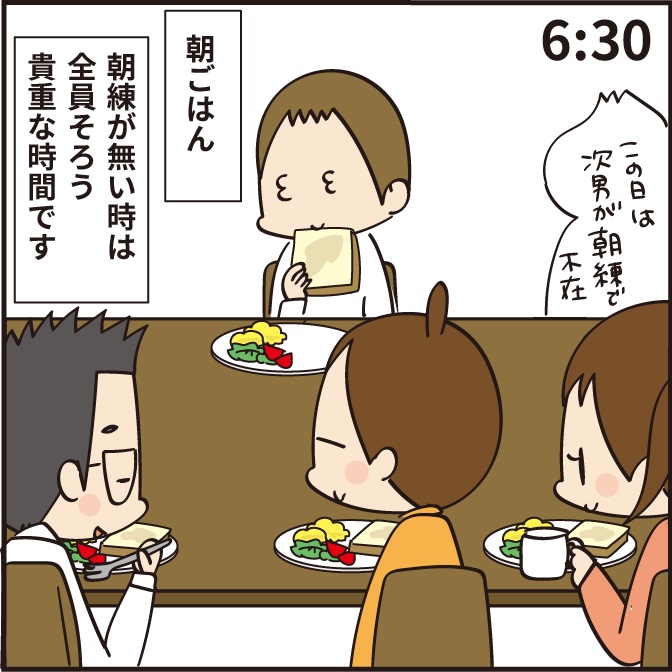 りく君の朝練がなければ 全員そろっての朝食 良いですね。子供が大きくなると 全員そろう事も 少なくなるから 貴重な時間ですね😃👍