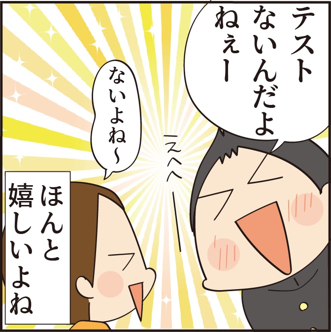 テストから開放されたスッキリ感!戻ってくる日は…また憂鬱ですが(笑)「テストいらねぇ。食べちゃうかな…」とか思いました(笑)