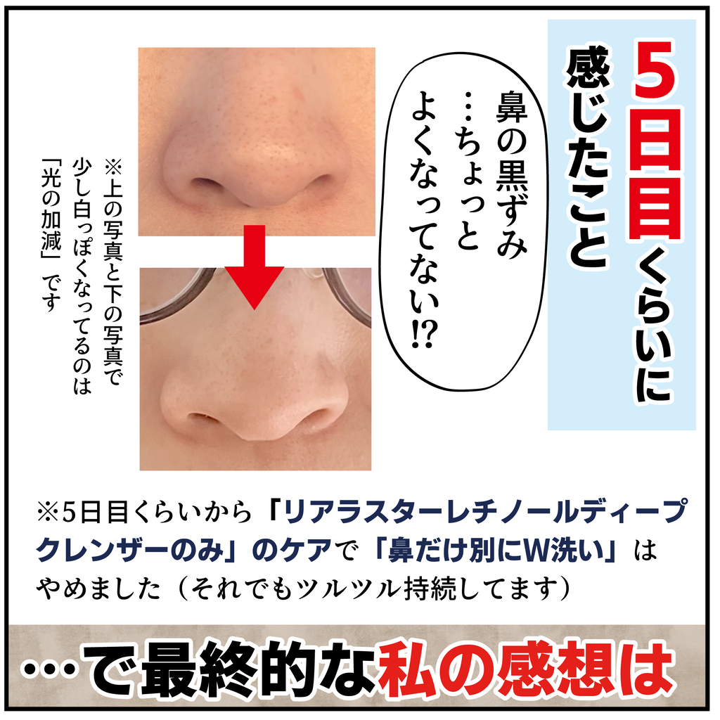 私のイチゴ鼻は頑固ものなので「この商品はW洗顔不要ですが4日間くらいは鼻だけは普通の洗顔料で洗ってました」