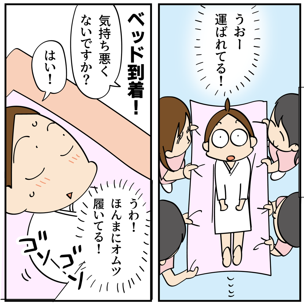そうそう!麻酔から覚めていない人(または覚めかけの人)を運ぶときは、こんな風に布?に乗せるんですよねー!母が全身麻酔で手術した時もそうでした