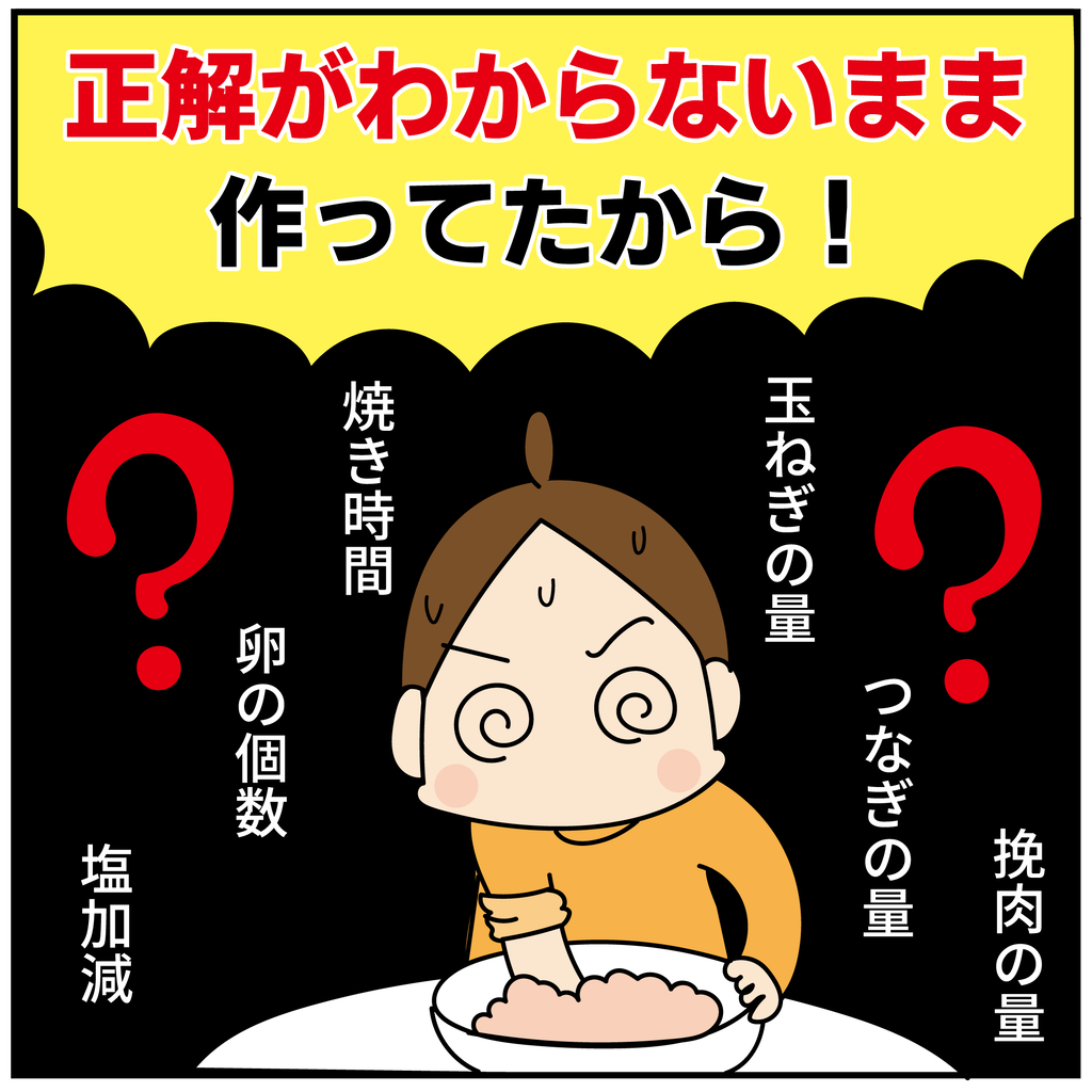 目指したのはマミィの作ってくれるハンバーグ。でもマミィは目分量で作ってたのではっきりした作り方が全然わかりませんでした。
