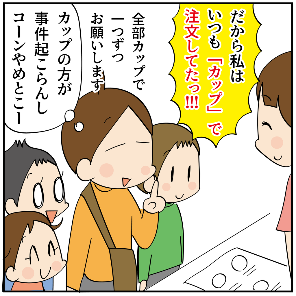 うちの娘たちは、長女は、コーンでアイスがとけて色々大変だったのをきっかけに、大抵はカップを選ぶようになってます笑