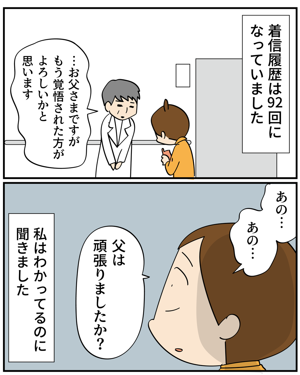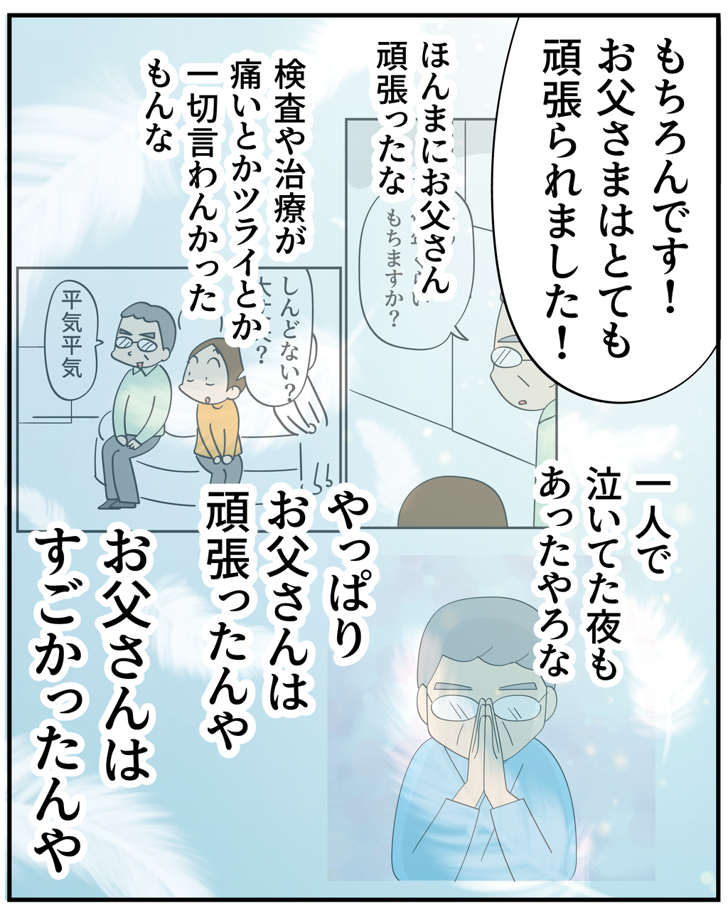 「父は頑張りましたか?」のけえこさんの言葉にぐっときました。頑張ってたから面会に行った時笑顔だったんだと思います。みんなに会いたいから……。
