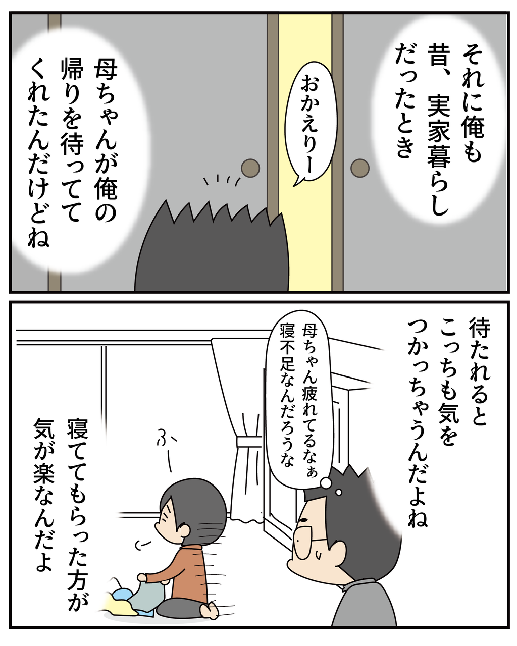 2025年11月29日 帰りが遅い長男と母の気持ち 大人として見てるつもりなのですが、まだまだですね…でもだいぶ気にならなくなってきたので、いい感じだと自分では思ってますwいつ帰ってきてるのかわかりませんが身体には気を付けてほしいです~↓塾の帰りが遅い妹のために↓ ↓つい、ナデナデしそうに!↓ ↓今も昔も全然話しません…↓ ☆最新記事をLINEでお知らせします!☆↓友だち追加はこちらから!↓※エラーが出る場合はお手数ですが「LINEホーム画面」→「上部検索バー」→「けえこで検索」をお願いします!★ブログランキング★↓クリックして応援してね!↓ Tシャツ作りました 「19歳」カテゴリの最新記事 < 前の記事次の記事 > コメント コメント一覧 (22) 1. 夢華 2025年11月29日 06:39 うちの母も同じことを言っていました やはり、お母さんというのは心配で目が冴えちゃうんですね 待つ方も待たせる方も気が楽になるほうがいいですしね 0 howawand がしました 9. 夢華さんへ 2025年11月29日 15:01 >>1 お互い気を遣わないほうが気楽ですもんね♪ いつまで一緒に住めるかわかりませんが、どうせいるなら居心地よい方がいいなと思ったので頑張ります~٩(ˊᗜˋ*)و 0 howawand がしました 2. カナ 2025年11月29日 06:40 おはようございます😊 ホント!ほんっとうに旦那様の言うとおりです! 成人してるし大丈夫! ワタシも仕事夜中に帰ってきてたんですが待たれてて困ってました。 風呂に入っている間に倒れたりしたらだめだからと風呂を上がるまで待たれていて😭 感謝していたけど困りました! その頃他にも色々ありまして、結局ワタシは一人暮らししましたよ〜 いつもニコニコ元気なお母さんのほうが嬉しいな なんかあって相談したくても疲れてそうだと遠慮して話すの躊躇してしまいそう。 そうなったらそうなったで、きづいてやれなかった!って後悔しそうだから! 寝て! 音で起きたらその時はトイレ行くていでおかえりぃ!って言ってほしい! 0 howawand がしました 10. カナさんへ 2025年11月29日 15:03 >>2 そうですよね。心配してちゃダメですね♪ カナさんの身体のことを心配されていたのですね。その気持ちよーくわかります! でもそれで親御さんが疲れてしまったら…と今度はカナさんが心配になってしまいますもんね💦 いつもニコニコ元気なお母さん!それめっちゃ大事ですよね。 そうなれるように頑張らないと。 ちゃんと寝て体力付けます~(♡´ㅂ`♡) 0 howawand がしました 3. どじゃ子 2025年11月29日 06:51 おはようございます😃 目からウロコが涙に見えて 旦那さんの 優しさに感激してるのかと😁 朝寝姿を見に行くなんて母の愛が止まりませんね たく君 わかっとるか❓ 風が吹く度に庭や家の前の歩道に葉っぱが 舞い散り 掃除に追われます まあ身体が あったまって良いんやけど しんどいわ😓 0 howawand がしました 11. どじゃ子さんへ 2025年11月29日 15:05 >>3 涙みたいに見えますよね♪もう旦那の言う通りだなと思いました。 成人してますしね。心配してもしなくても結果は変わらない!と思うようにして寝ることにしました☆ 葉っぱがどんどん落ちていきますよね。見てる分にはきれいだなぁ~と思いますがお掃除は大変!無理しすぎないでくださいね~!! 0 howawand がしました 4. もも 2025年11月29日 06:54 私の母も父の帰宅を待ってから夕食を共にしていました🍽️いつも夜8時過ぎていましたが必ず待っていたのでそういうものなんだと思い私も結婚してから母と同じように主人の帰宅を待ってから夕食を共にしていました🍽️でもある日実家で食事をしていたら父がけえこさんの旦那様と同じような事を言い、主人も同調していたんです!!逆に気にしてしまうから先に食べていてほしいと!勝手に待っているつもりが逆にプレッシャーを与えていたとはつゆ知らず💦それからは先にいただいているようになりました🥣 けえこさんの旦那様の言う通りですし、どこの家庭でも優しさが時に違う方向になってしまうのですね☺️ 今日も優しくてまあるいお話をありがとうございます🍀 0 howawand がしました 12. ももさんへ 2025年11月29日 15:08 >>4 お母さまの姿を見ていたらそういうものだと思ってしまいますね♪お母さま、一緒に食べたいと待っててくれるのとてもお優しい♡でもお父様は「待っててくれてるから早く帰らないと」って焦ってたんですね。やさしさの連鎖…。°(°´ω`°)°。 人を想う気持ちは変らないし、お互いが楽な道を目指したいですね♡ 0 howawand がしました 5. ひろみ 2025年11月29日 07:43 私は……ねてます(笑) 特に…体調悪くなった連休明けぐらいから(かれこれ3週間経ちましたよ)変な時間に眠くて仮眠が……爆睡…… けえこさんの目から大粒の涙……じゃなくて……うろこ!?表現が好きです♪♪ けえこさんハホントに怪盗キッド好きですね〜( ꈍᴗꈍ)私もコナン好きだけど「スパイファミリー」のロイドさん好きですが……全キャラ好きです(笑) 0 howawand がしました 13. ひろみさんへ 2025年11月29日 15:09 >>5 もう3週間経ったのですねー!!体調