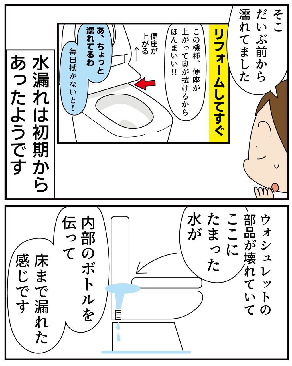 毎日ではないし、謎でしたが原因はウォシュレットの管の劣化でした。うちは夫が夫の母の介護のため市内の実家で生活していて我が家と行ったり来たりしています。それでたまたま夫が家でウォシュレットを使った時だけ水漏れしていたので、たまに床が濡れている…ということになっていたのです。原因がわかる前は便器の交換を覚悟していましたが、ウォシュレット便座の交換だけですみました。
