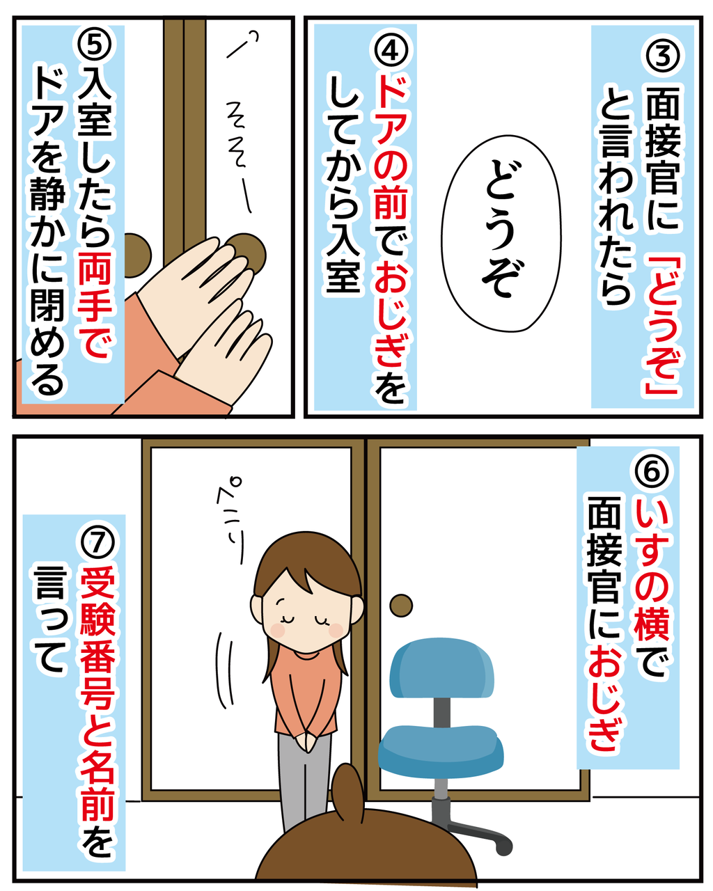 なんと細かいルール&マナーがあるんでしょう(^_^;)実際の面接官さんが優しそうで良かったですね(#^^#)