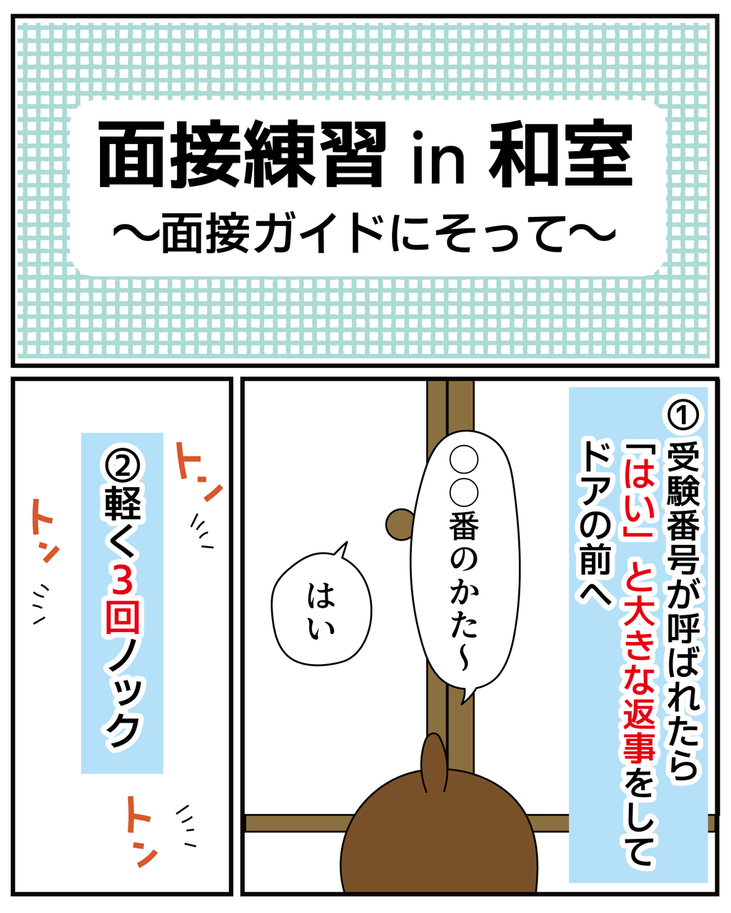 ノックの回数とか、おじぎのタイミングとか…今考えると別にどっちでもいいのでは?みたいなものが多いのですが、当時は間違えたら大変!と必死でした(^^;)